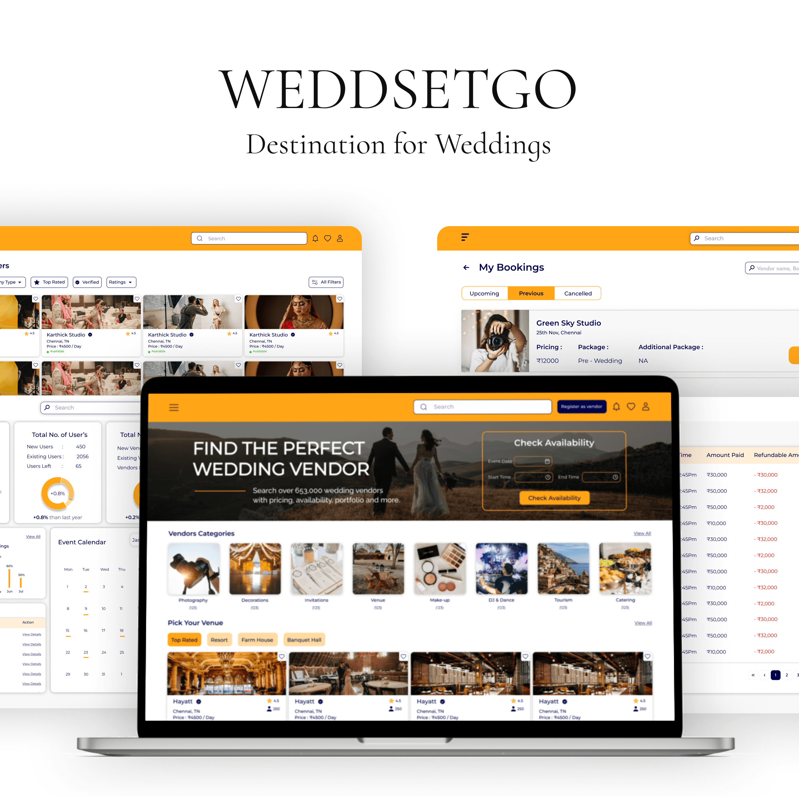 A seamless and elegant UI/UX design for an all-in-one wedding platform that simplifies planning by integrating décor, catering, venue booking, and event management. The interface offers intuitive navigation, personalized dashboards, vendor listings, real-time availability, and interactive planning tools—ensuring a stress-free and delightful experience for couples from "Yes" to "I do."